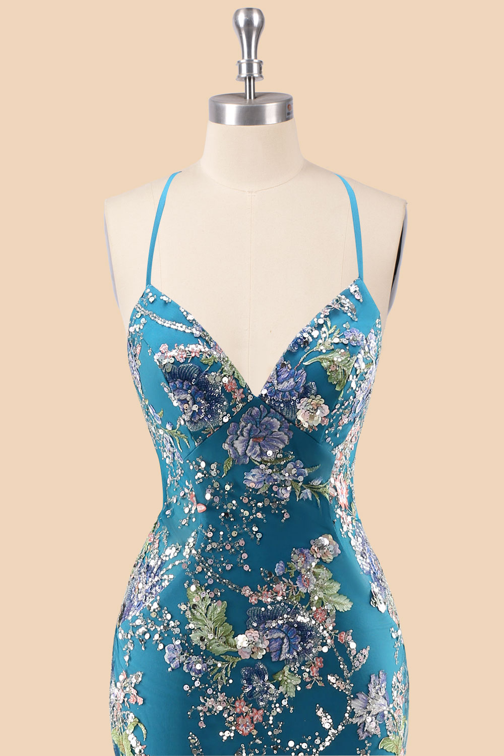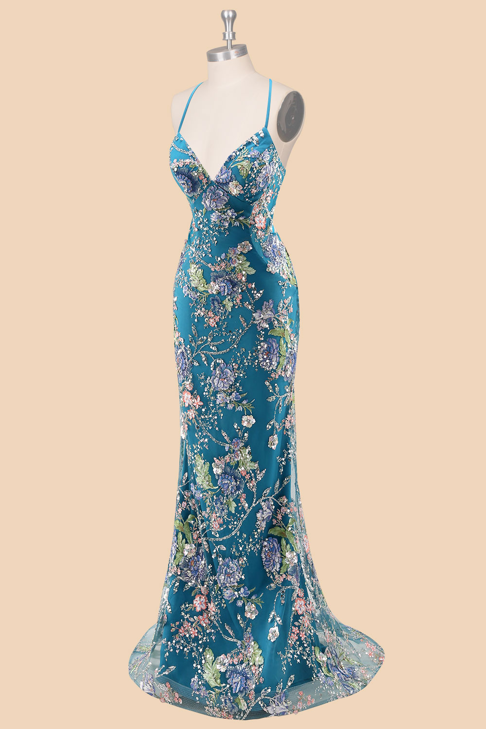Custom floral embroidery sequin long prom dress, peacock blue sparkly corset evening gown