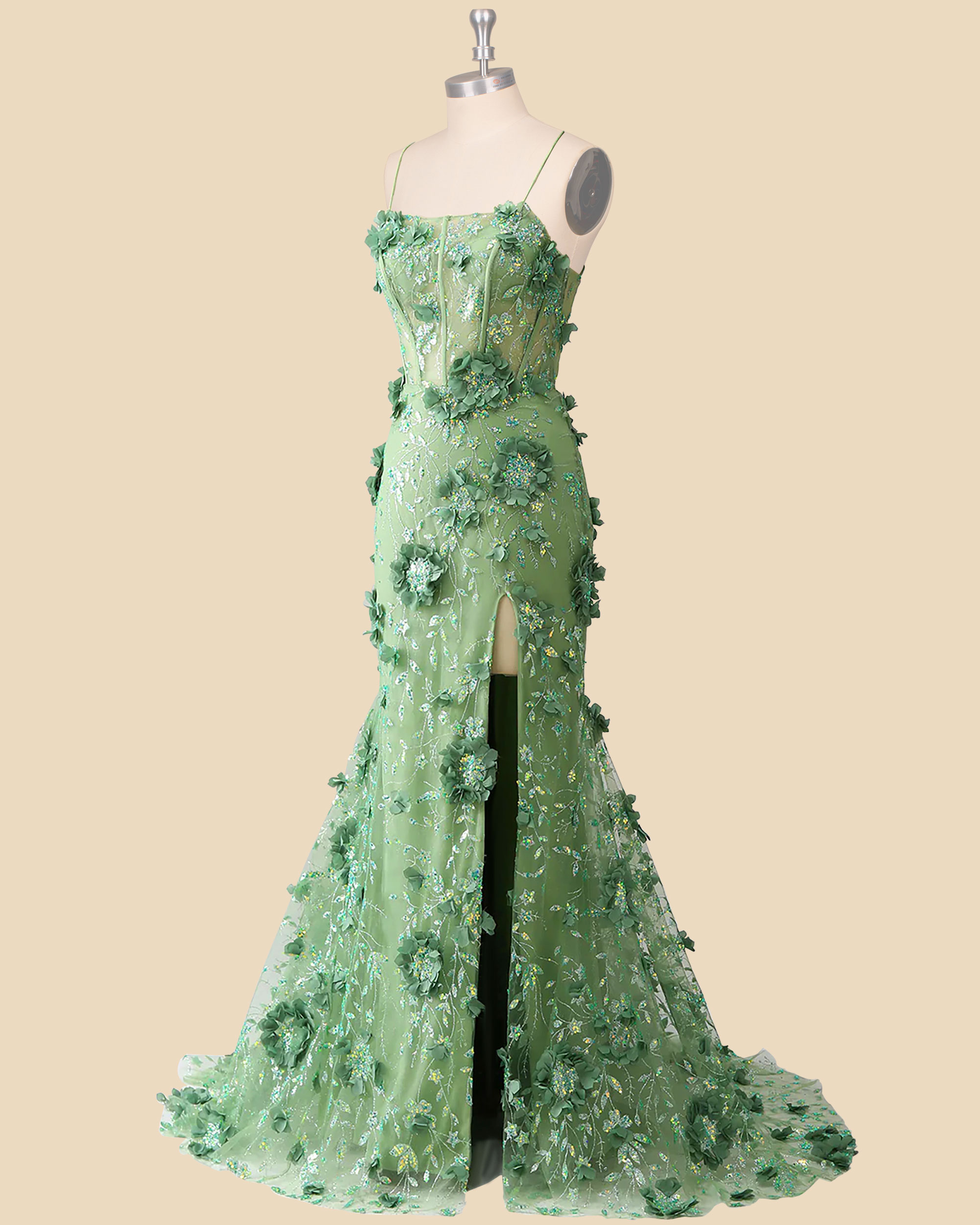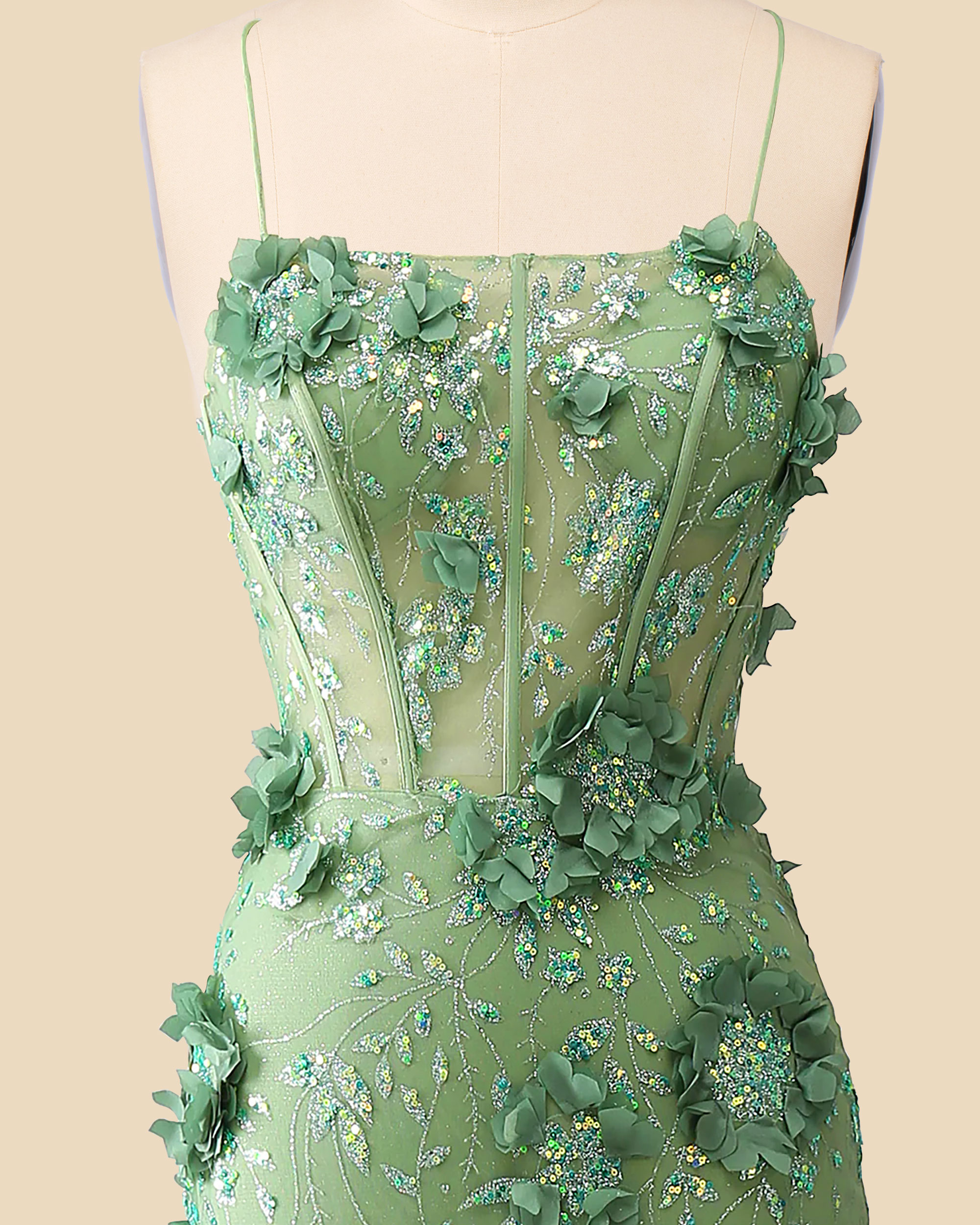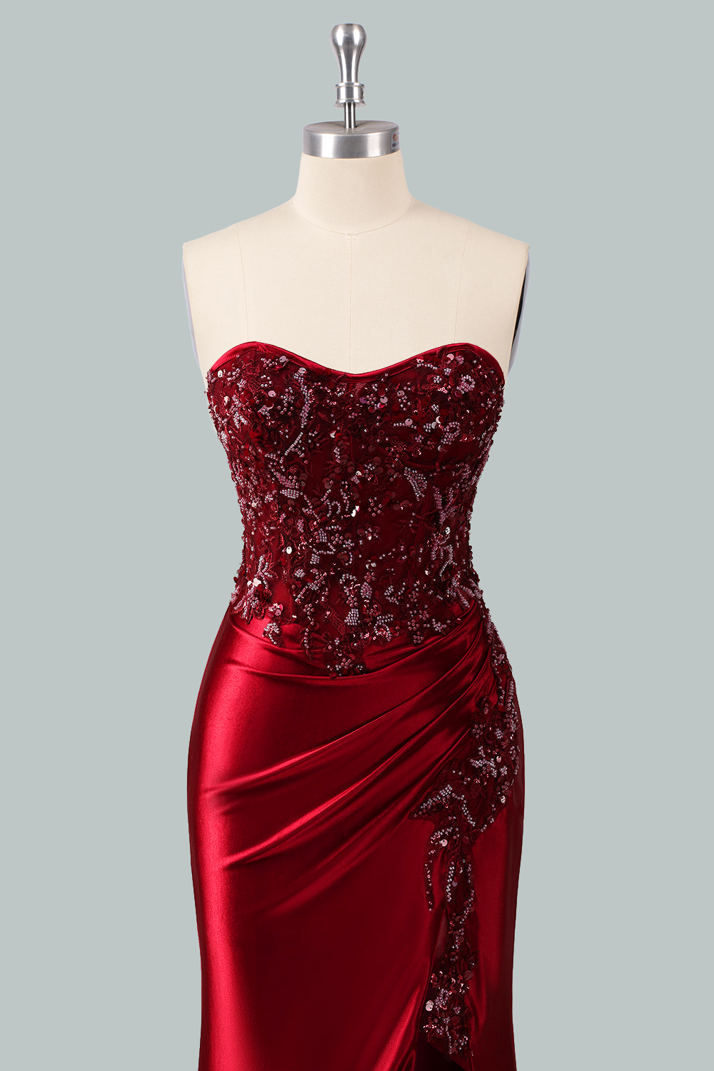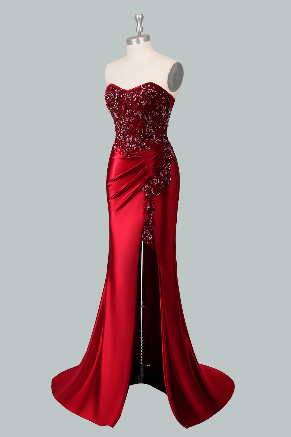 Custom sequin floral corset long prom dress, red satin slit party dress