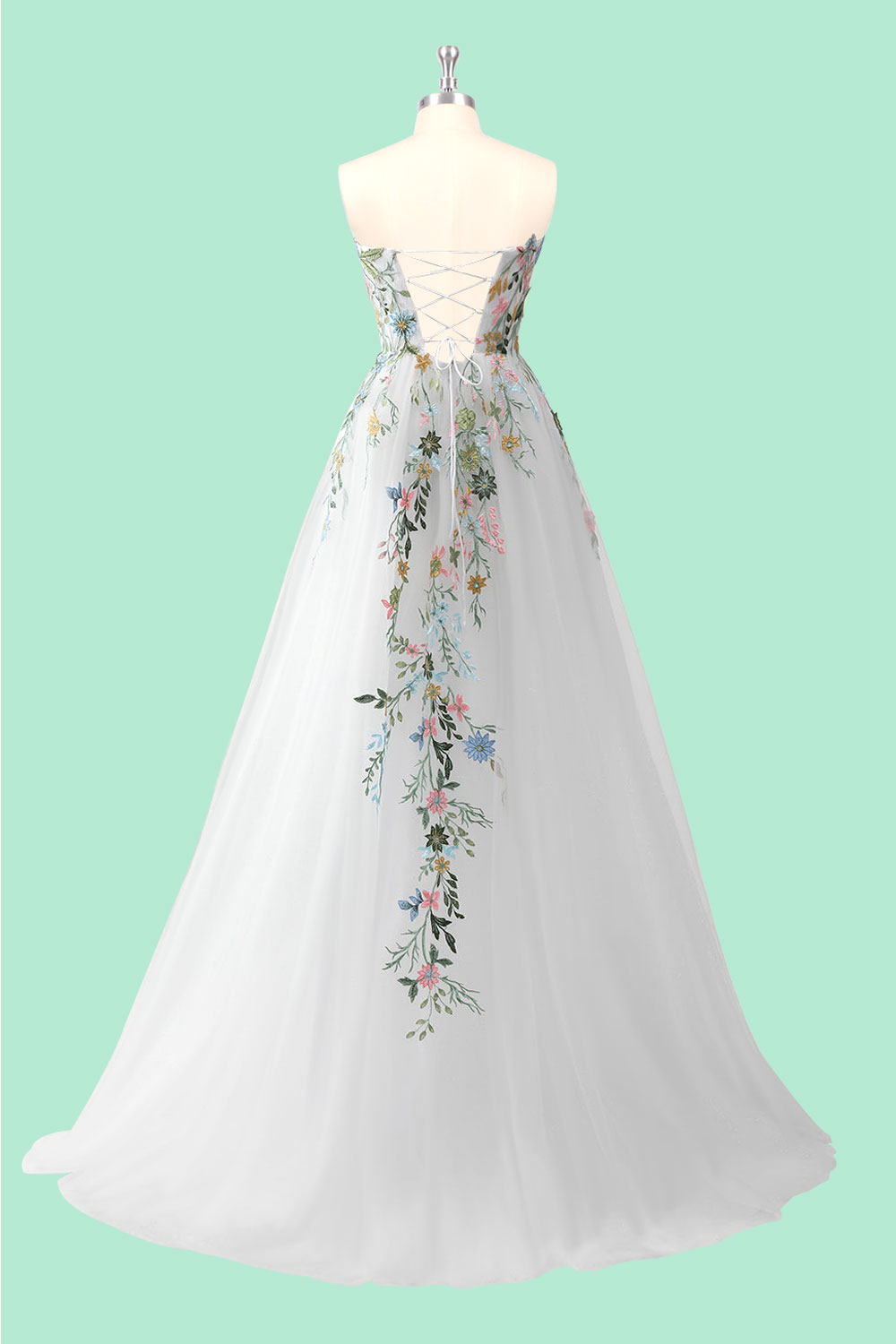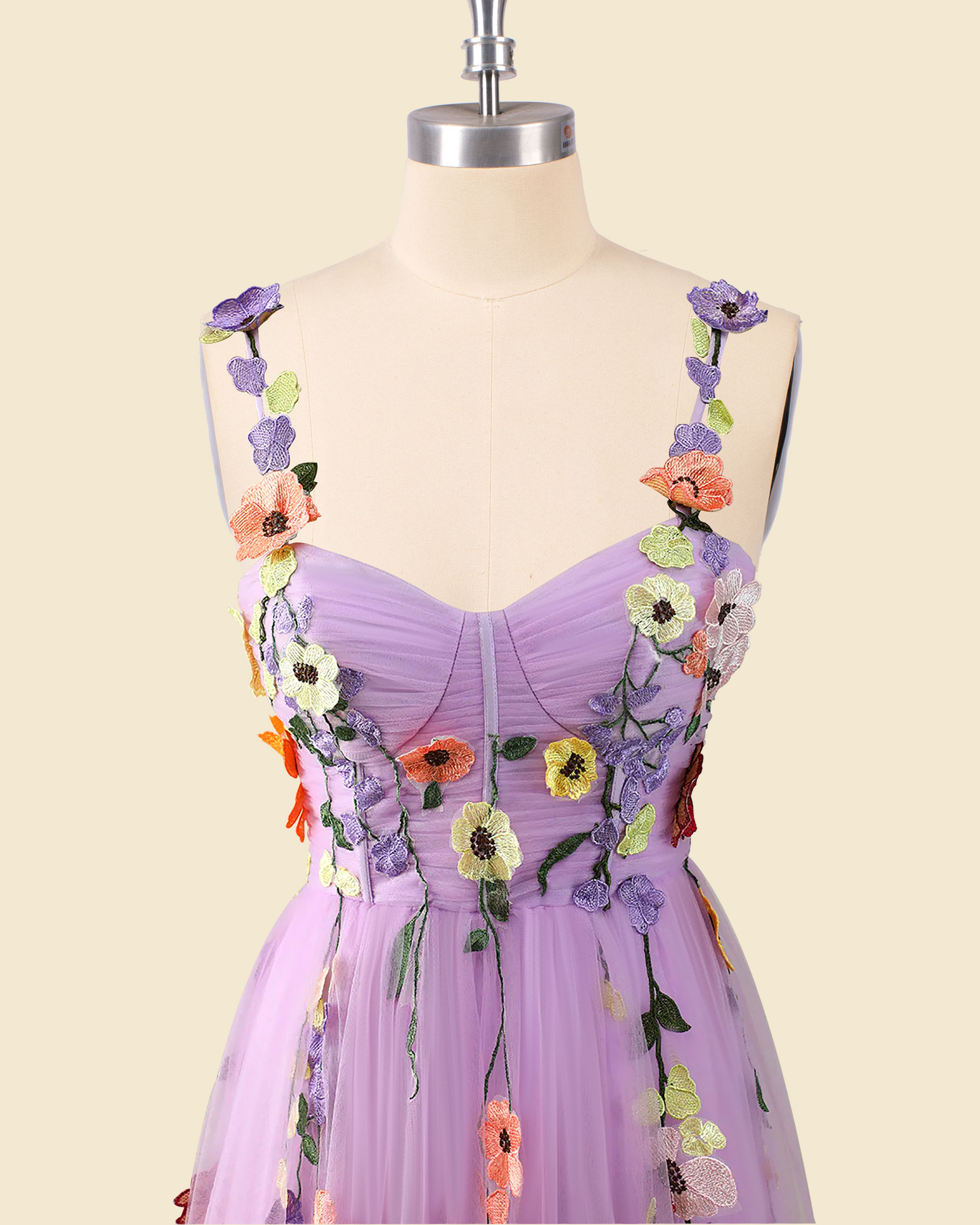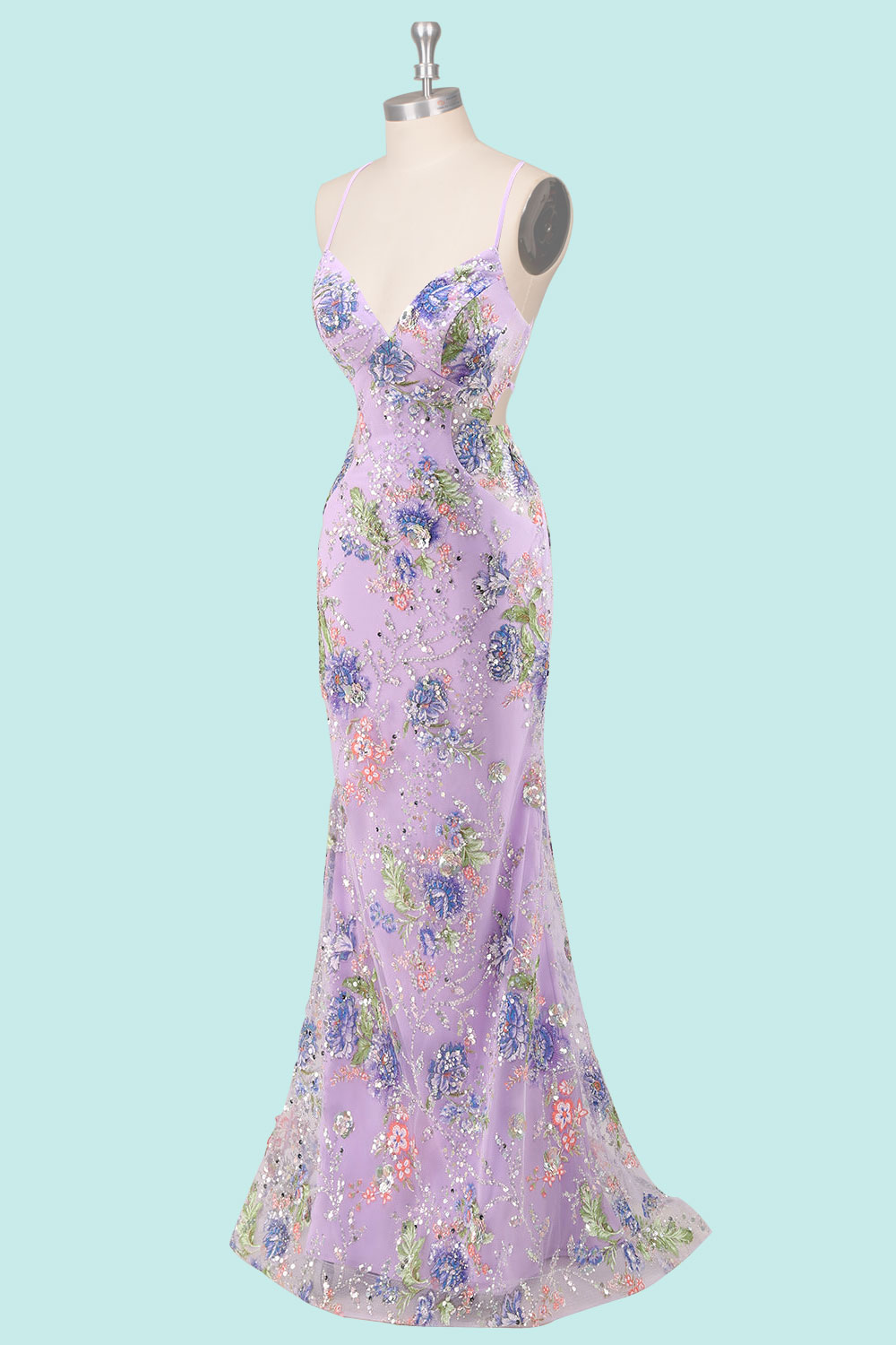Custom floral embroidery sequin long prom dress, light purple sparkly corset evening gown