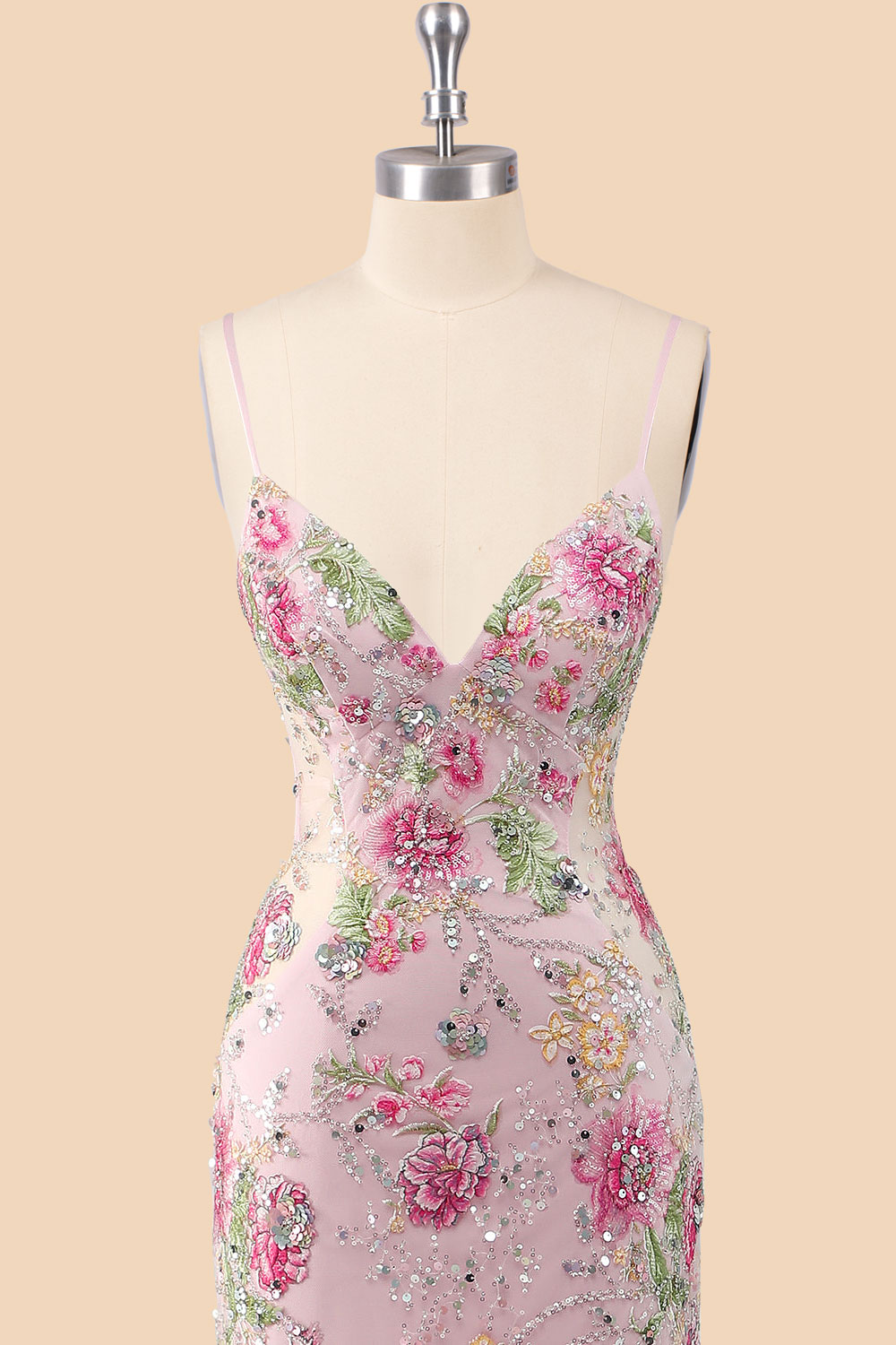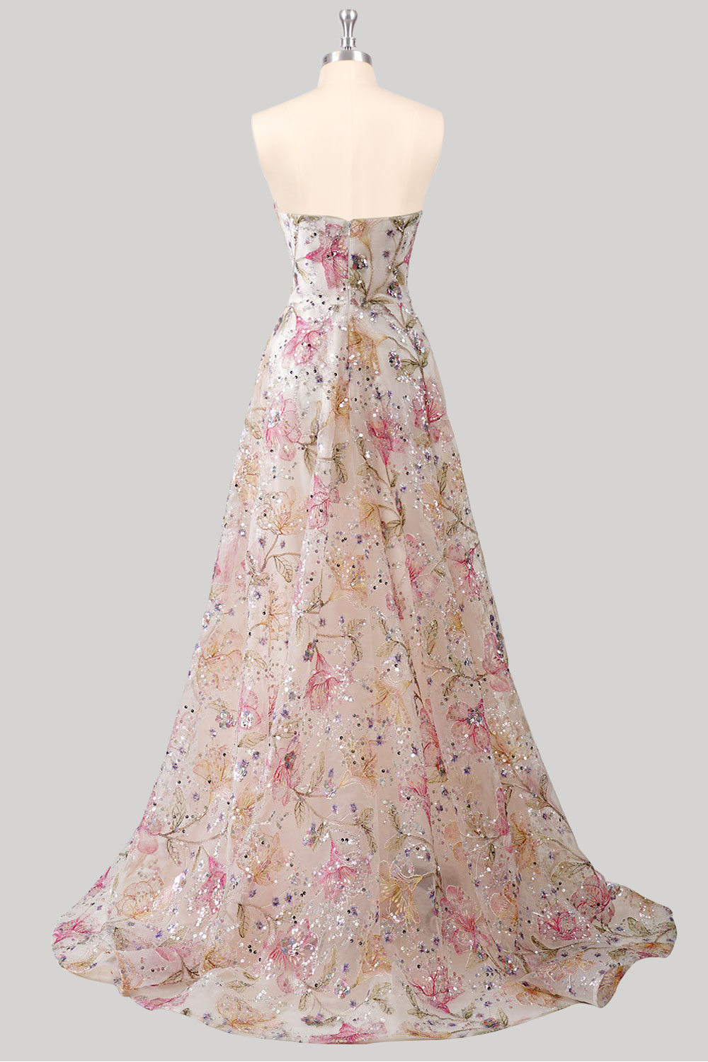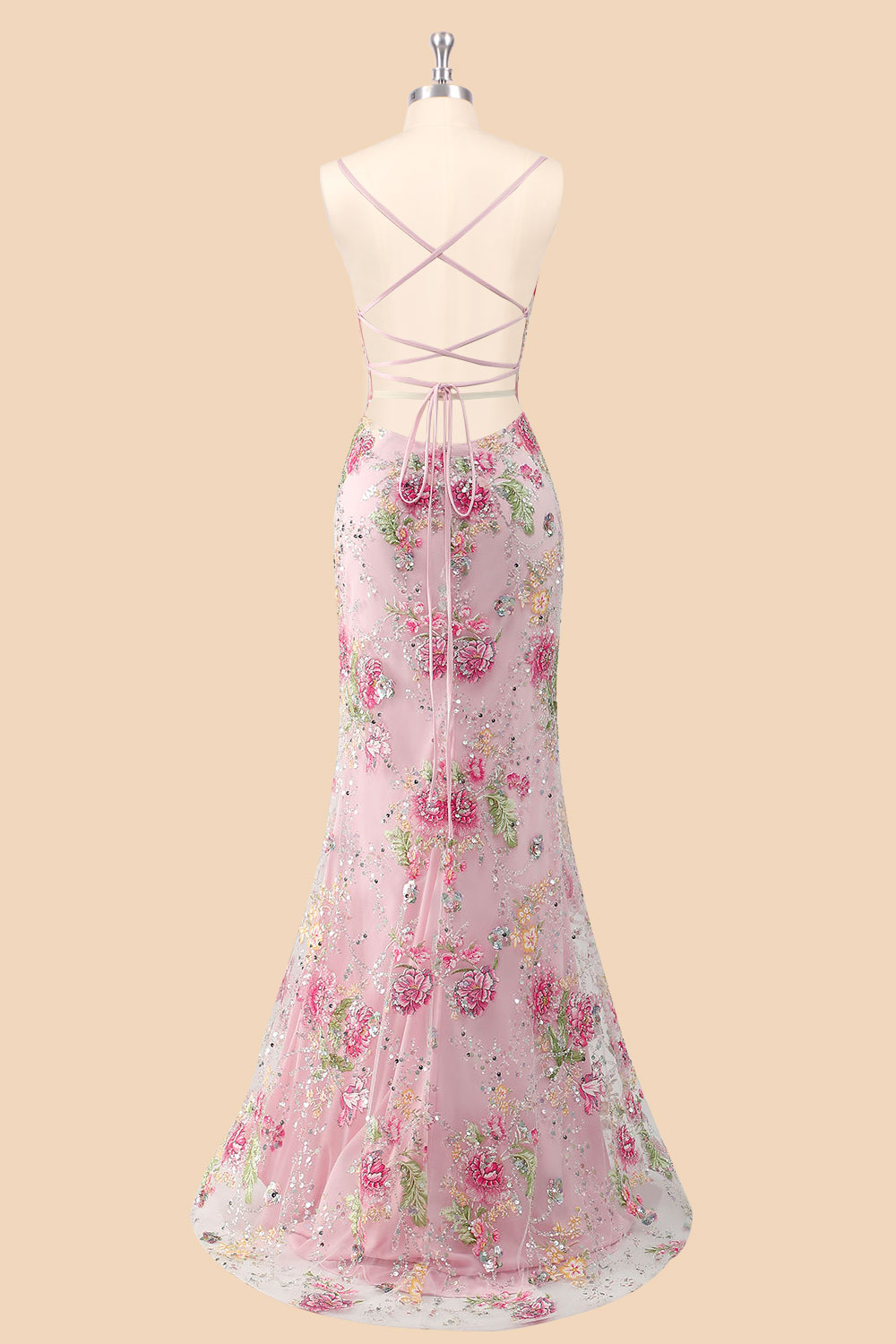 Custom floral embroidery sequin long prom dress, pink sparkly corset evening gown