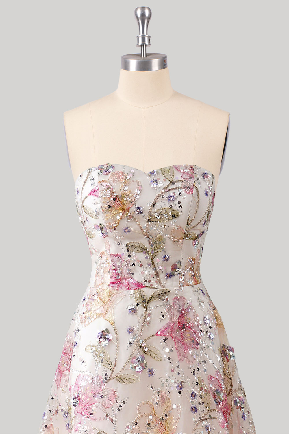 Custom sparkly light pink fairy corset long prom dress, strapless sequin embroidery party dress